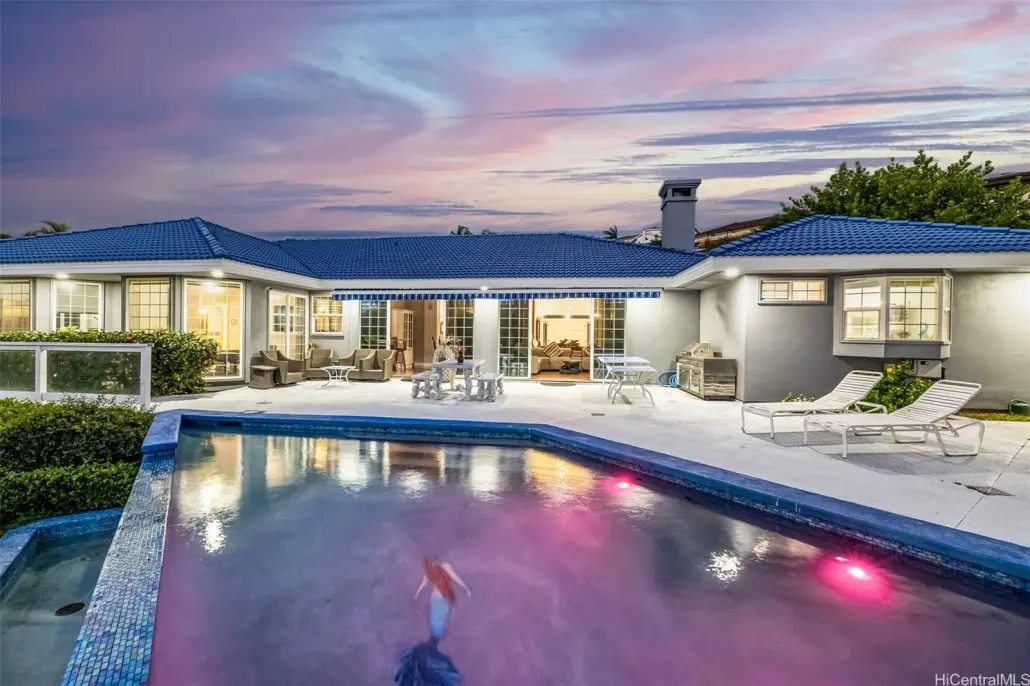 This home is designed for easy living, with no stairs and everything on one level. When you enter through double doors, you’ll see high ceilings that make the space feel big and has a view of Koko Crater and a bit of the ocean. The kitchen has been redone and is open to the dining area and outdoor spaces. It has new appliances, a wine chiller, lots of counter space, and a cool backsplash. There are flexible rooms that can be a media room, office, or an extra bedroom with smart technology like energy-saving lights and a surround sound system. The main bedroom has a big closet for both him and her, a fancy bathtub, a double shower, and heated towel racks.