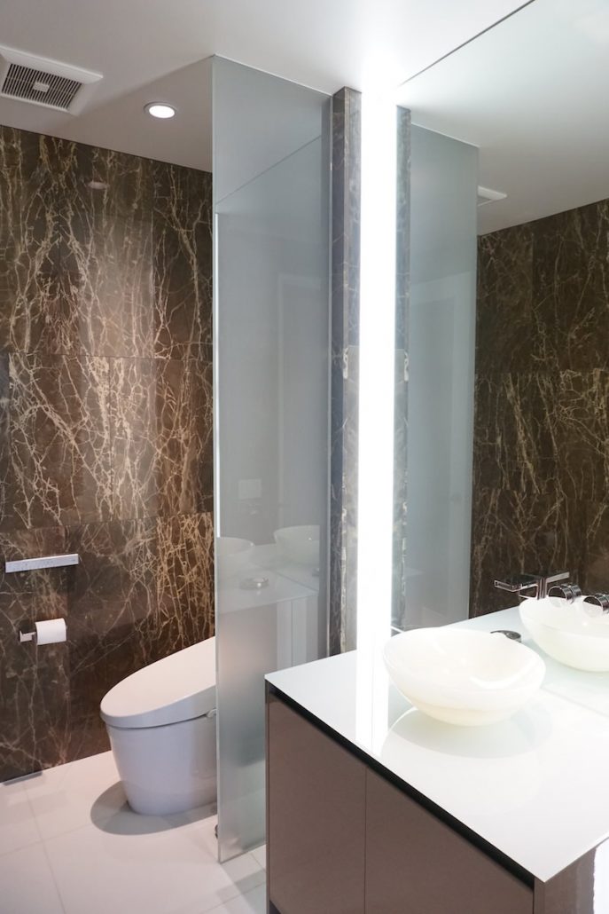 Dramatic powder room includes onyx walls with programmable Toto toilet
