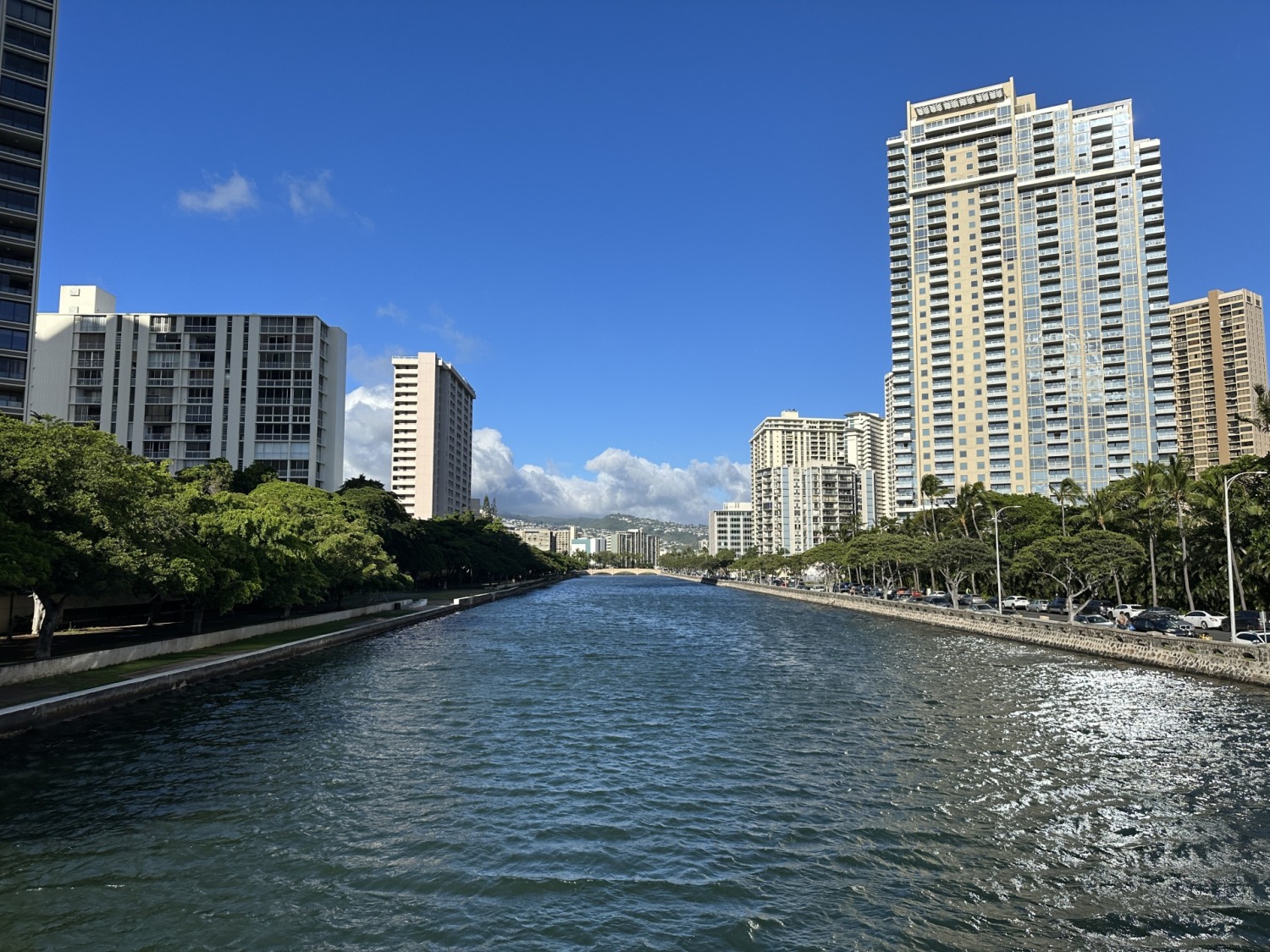 Honolulu’s Ala Wai canal with the Watermark condo building on the right January, 2023 | ® Hawaii House
